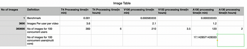 Let’s assume we have done benchmarking of our model per image. Using that we are calculating the inference time for our system.