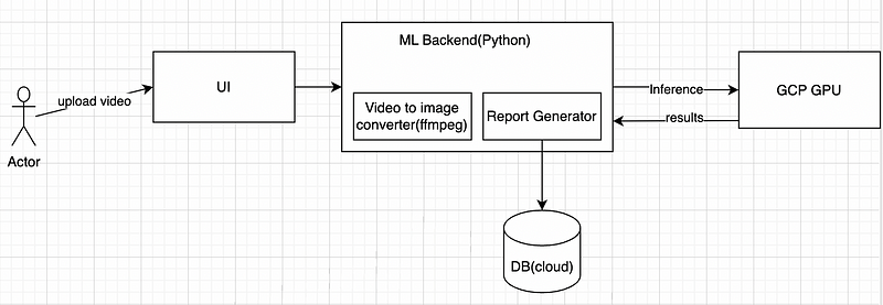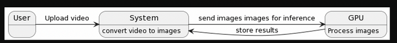 User uploads video -> system converts video to images-> images passed to ML model-> backend system uses results to create report and store data to database.