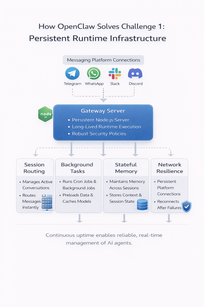 - OpenClaw runs as a persistent Node.js gateway server that stays alive continuously.
