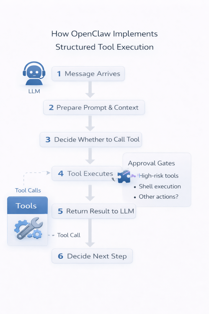 OpenClaw uses a structured tool execution loop: